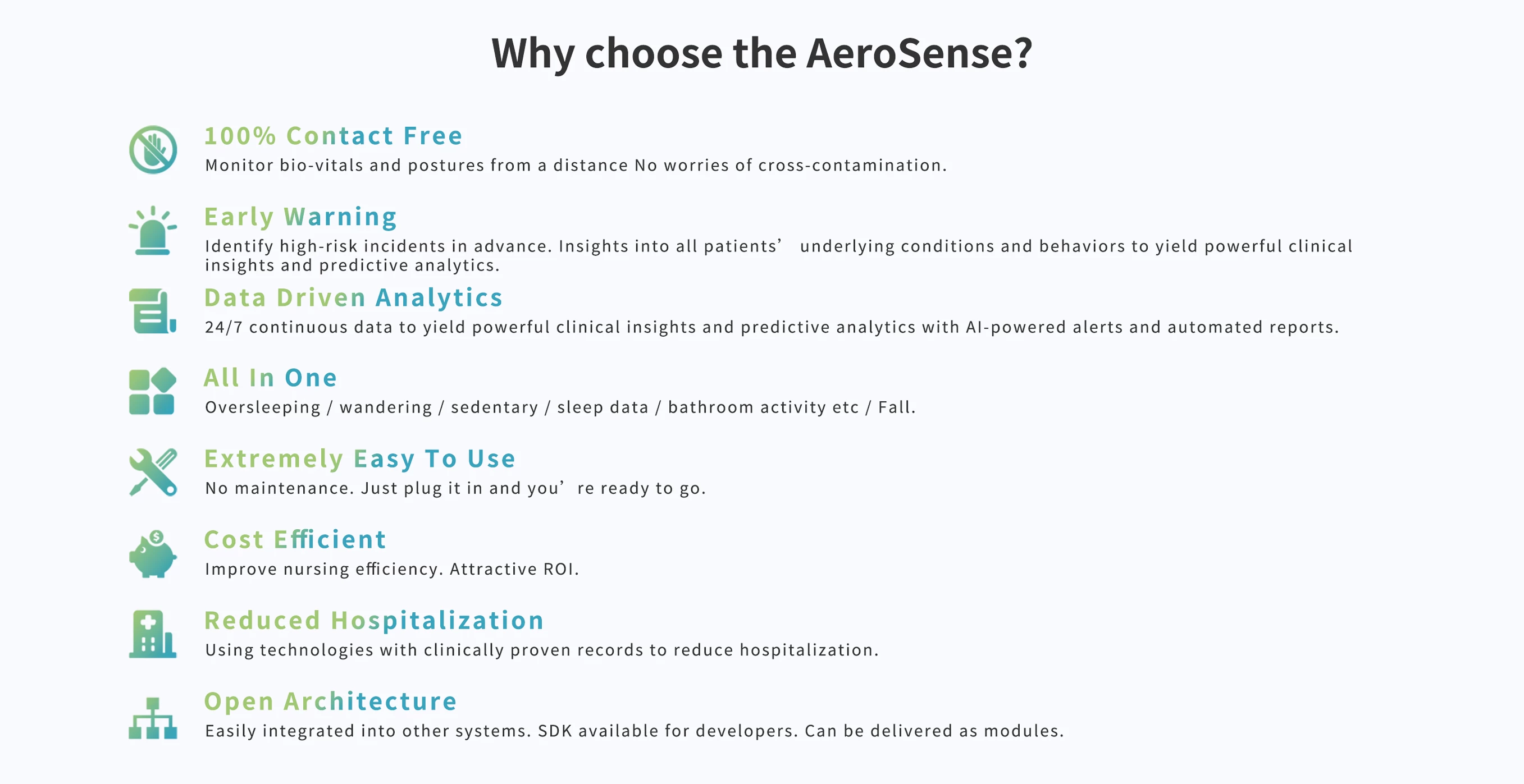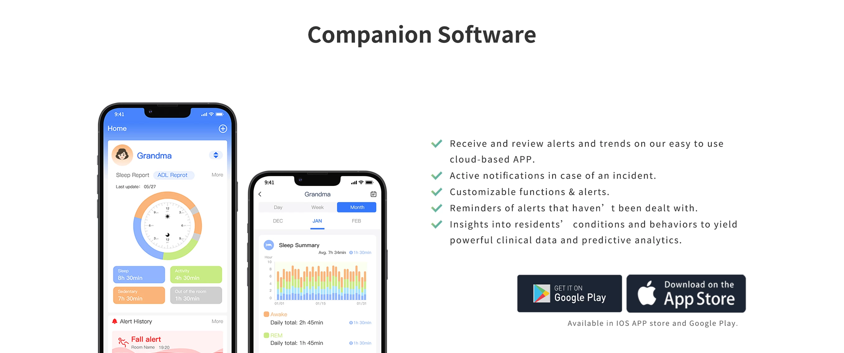 ![]() | We are an excellent smart elderly care product ჭკვიანი და უკონტაქტო მონიტორინგისა და ადრეული გაფრთხილების მოწყობილობა. შექმნილია მაღალი საშიშ რისკების დასადგენად ყოველდღიური ცხოვრების ასაკის მოქალაქეებისთვის. მიიღეთ სიგნალები მოხეტიალეისთვის, გადაკვეთა, უმოქმედობა, ვარდება და სხვა! ინციდენტის შემთხვევაში, განგაში იგზავნება სასწრაფო კონტაქტებზე სატელეფონო ზარების საშუალებით, ტექსტური შეტყობინებები, ან აპლიკაციის შეტყობინებები. წარმოქმნათ მონაცემთა დაფუძნებული ანალიტიკური ჯანმრთელობის შესახებ ცნობები, რომლებიც ხელს უწყობს დაავადებების ადრეულ დიაგნოზს. |