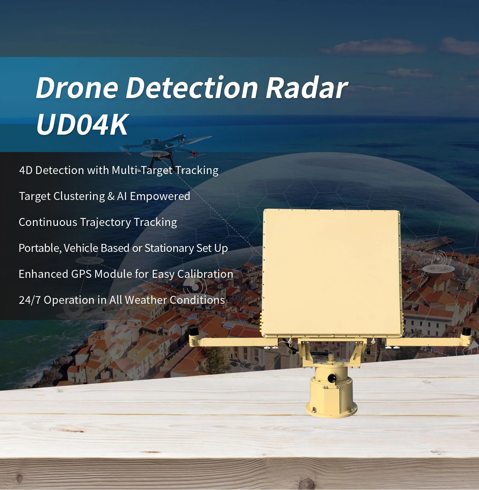 The UD04K drone detection radar is a cost effective 4D DBF radar with superior performance. It detects mini-UAVs up to 4 km in range and has capability to identify up to 100 targets simultaneously. UD04K captures 4D data including range, azimut, Héicht, and speed. Radar is an essential sensor for anti-drone solution. We highly recommend federal facilities, Fluchhafen, power plants, Ueleggrënn, borders and stadiums equip UD04K to mitigate drone threats.