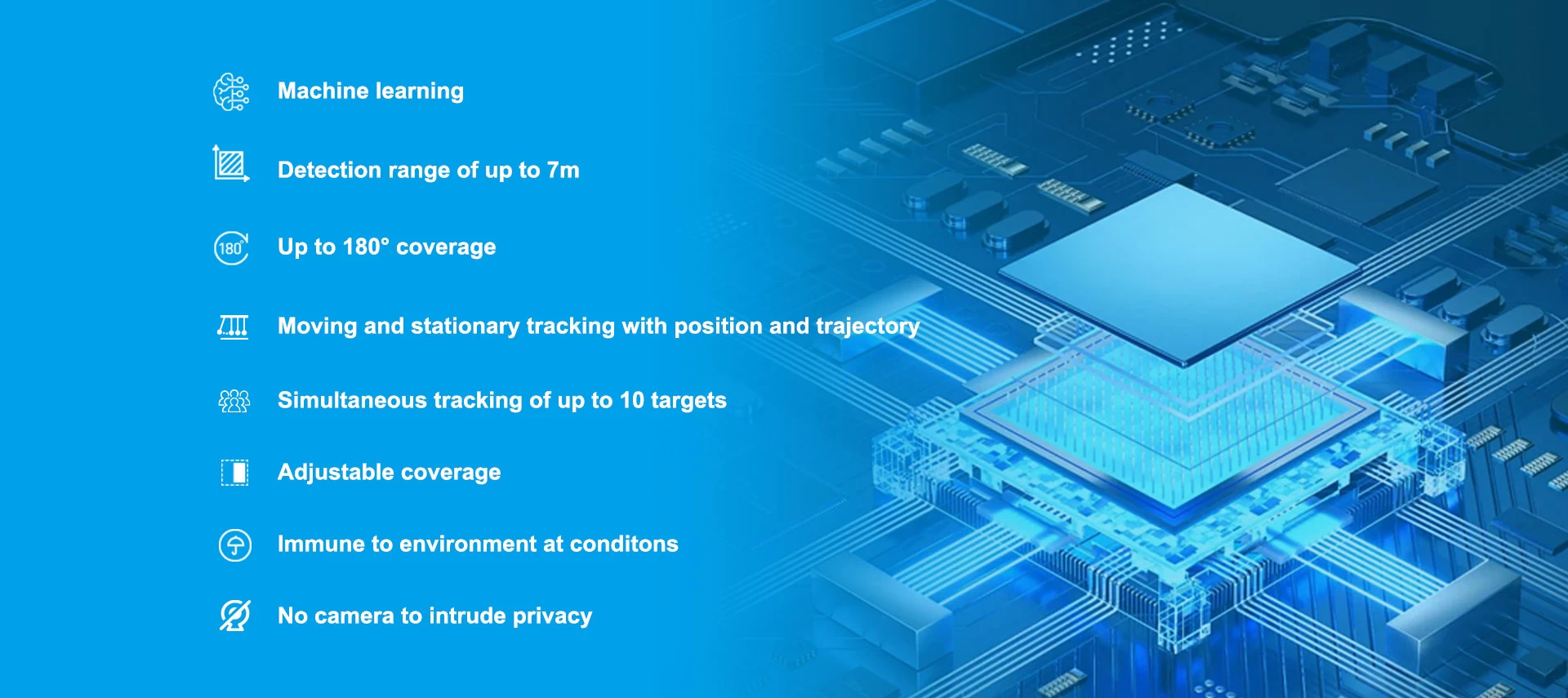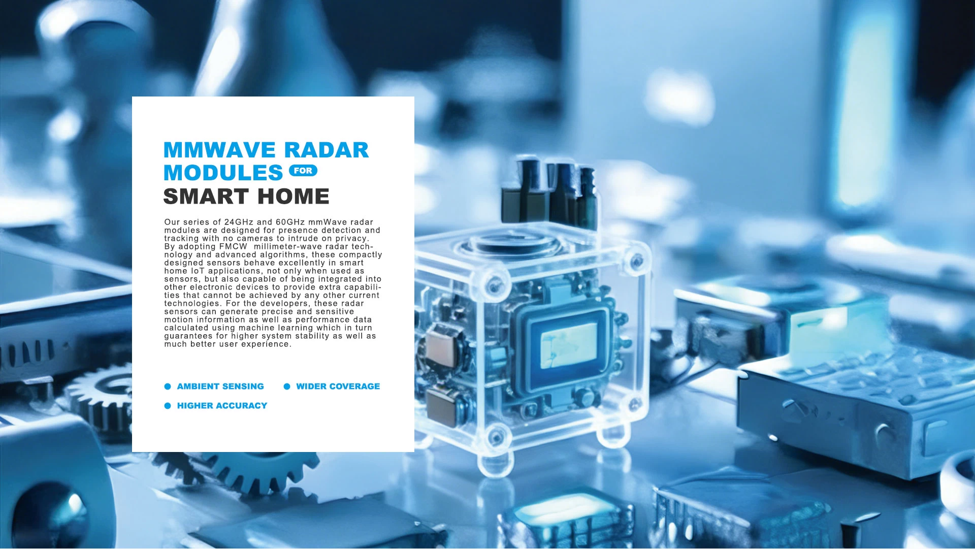 Our series of 24GHz and 60GHz mmWave radar modules are designed for presence detection and tracking with no cameras to intrude on privacy. By adopting FMCW millimeter-wave radar technology and advanced algorithms, these compactly designed sensors behave excellently in smart home IoT applications, not only when used as sensors, but also capable of being integrated into other electronic devices to provide extra capabilities that cannot be achieved by any other current technologies. For the developers, these radar sensors can generate precise and sensitive motion information as well as performance data calculated using machine learning which in turn guarantees for higher system stability as well as much better user experience.